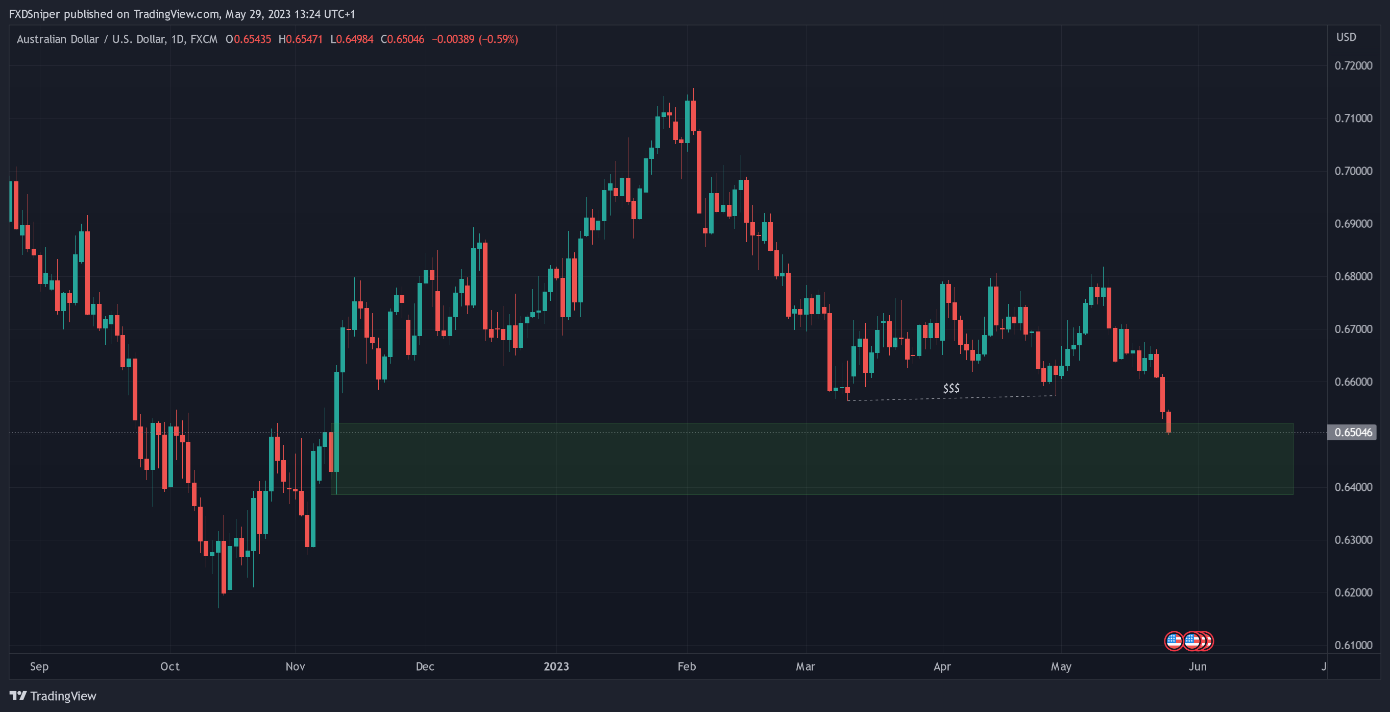 This is a daily chart on AUD/USD. Ideally you want your point of interest zones to be placed under/above liquidity areas. We know that the market will often take out the previous low/high before the actual move happens.